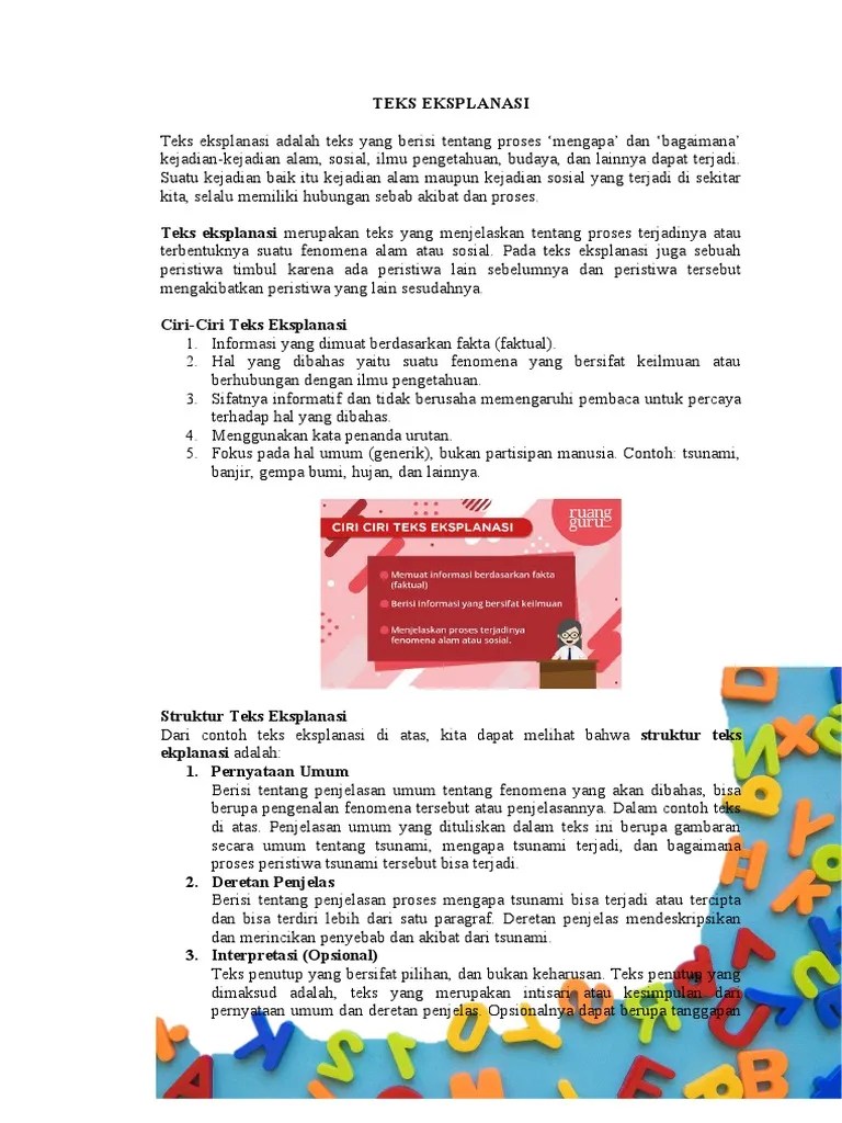 Teks eksplanasi ilmiah adalah tesk yang menjelaskan suatu proses tentang ilmu pengetahuan. Teks eksplanasi adalah salah satu jenis teks yang dikembangkan berdasarkan kaidah ilmiah. Eksplanasi adalah teks yang berisi tentang proses . Simak pengertian, struktur, dan contohnya. Teks ini bertujuan menjelaskan sebuah fenomena baik itu alam .