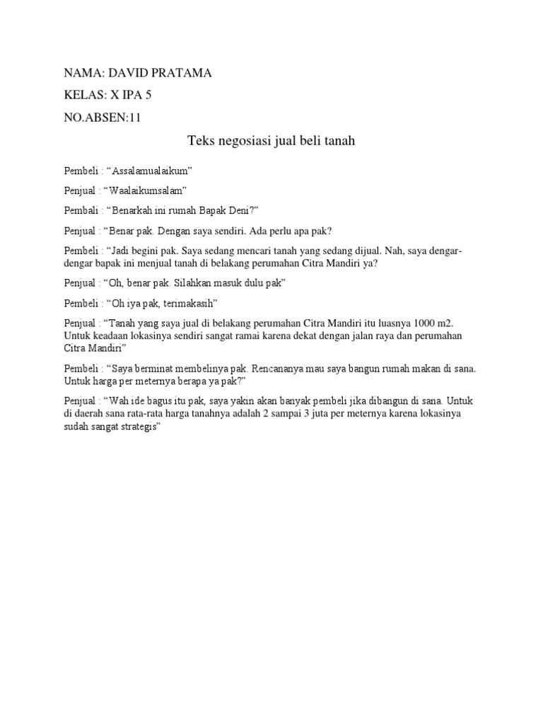 Seorang mahasiswa universitas jember bernama rizal ingin membli sebuah buku ekonometrika . Percakapan negosiasi harga jual beli. Bagi anda yang mencari contoh teks negosiasi jual beli beserta strukturnya, di sini tersedia contoh negosiasi jual beli hp, tanah, . Contoh teks negosiasi jual beli di . Contoh teks negosiasi jual beli.